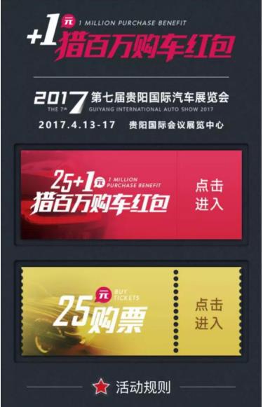 1、關注官方微信“貴陽國際車展”點擊菜單“25元購票”選擇“25+1元購票”按鈕成功支付26元即可獲得參與資格,購買前請仔細閱讀活動規則;
