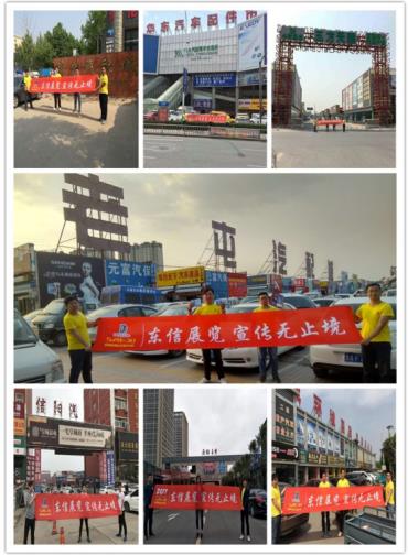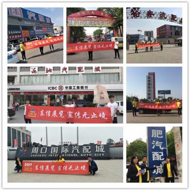歷時20天左右的宣傳,東信展覽招觀團隊拜訪了安陽豫北興達汽配城、邯鄲中原配件商城、邯鄲宏達汽配城、菏澤富年齊魯國際汽配城、菏澤汽配市場、濟寧美恒國際汽配城、洛陽豫西汽配市場、洛陽林安汽車用品城、洛陽北環汽配城、石家莊東聯汽配城、石家莊冀源汽配城、保定裕豐汽配城、長治市汽貿汽配城、長治市泰舸汽配園區、長治空港乾得龍汽配城、長治黃河汽配市場、臨沂市汽摩配城、徐州中國汽配城、廊坊汽配城、北京五方天雅、北京盛華汽配城、北京城外城國際汽配城、南京高力汽配城、南京仙林汽配城、南京寧南汽配城、南陽汽配市場、西安海納汽配城、西安東風汽配城、西安三橋汽配城、德州機動車配件市場、德州汽配城、合肥南翔汽配城、合肥汽配城、合肥中汽聯汽配城、濟南華東汽車配件市場、濟南老屯汽配城、濟南山東汽配城、武漢常碼頭汽配城、武漢長豐萬國汽配城、武漢黃金口汽配城、武漢鑫豐萬國汽配城、襄陽汽配城、襄陽三元街、襄陽華中光彩市場、襄陽天潤市場、淄博汽配城、淄博王舍汽配城、聊城萬里國際汽配城、信陽汽配城、周口國際汽配城等23個城市、50個汽配城及汽配集散地,行程16817公里,拜訪19600余家經銷商戶,超過13200余家客戶表示均會到達展會現場、且有合作采購意向。