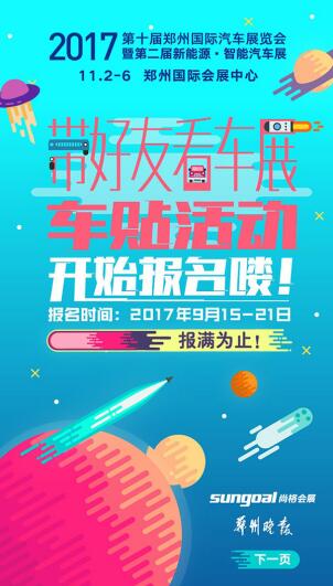鄭州國(guó)際車(chē)展十周年,為了回饋廣大車(chē)友對(duì)鄭州國(guó)際車(chē)展的支持與厚愛(ài),現(xiàn)給有車(chē)一族送福利來(lái)了!你開(kāi)車(chē),我加油!鄭州國(guó)際車(chē)展全城車(chē)貼活動(dòng)火熱進(jìn)行中...本次活動(dòng)由去年的600個(gè)名額增加到1200個(gè)名額,并且保證人人都有油卡領(lǐng)!