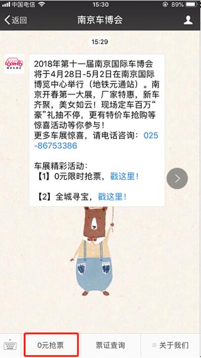 3、進(jìn)入微信服務(wù)號(hào)后查看菜單欄的“0元搶票”,按照提示填入基本信息即可搶票成功。