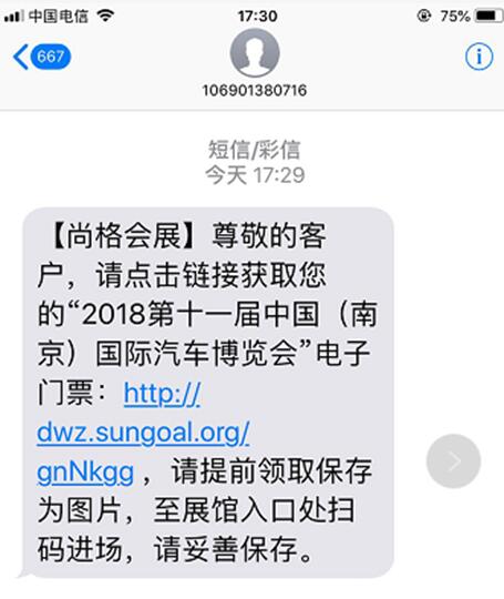 4、您將收到車展組委客服的電話,核實(shí)信息后您將收到一條提示短信,包含電子票鏈接(點(diǎn)擊鏈接打開(kāi)圖片即可查看票面信息,請(qǐng)妥善保管,憑票面二維碼在車展現(xiàn)場(chǎng)掃碼觀展)。請(qǐng)務(wù)必保證聯(lián)系方式準(zhǔn)確無(wú)誤,并保持電話暢通。