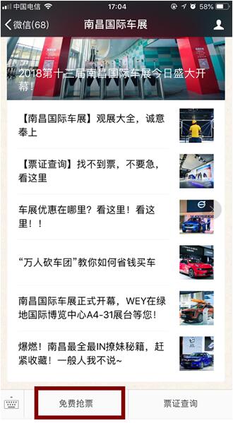 參與“免費搶票”的方式也很簡單,搜索微信公眾號“南昌國際車展”,關注車展官方微信。