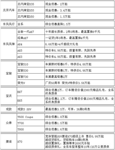 各參展品牌也針對不同車型給出不同優惠政策,以下為部分參展品牌優惠信息,更多優惠請到車展現場咨詢品牌經銷商: