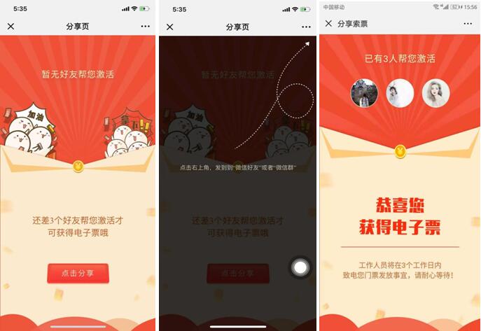 3、報名之后跳轉(zhuǎn)到分享頁面,點擊右上角,分享給三個好友幫您激活才可獲得電子票。