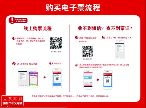 通過官方微信【南昌國際車展】“票證查詢”菜單進(jìn)入證件查詢點擊“電子證查詢”菜單;電子門票查詢點擊“電子票查詢”菜單查詢;