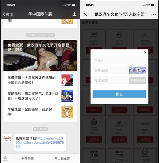 ①進入“華中國際車展”官方微信,點擊菜單“萬人砍車團”,選擇自己的意向品牌并報名參與活動。(注意:一個人僅能參與一個品牌的砍車團活動,請慎重選擇!)