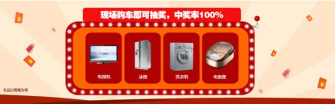 現場購車的觀眾,憑購車合同、付款憑證及身份證,即可參與購車抽獎,“彩電”、“冰箱”、“洗衣機”等獎品,樂享不停!獎品豐厚,中獎率為100%!