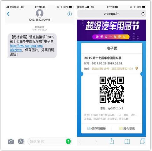 3、接下來,請注意接聽來自武漢市的客服電話(座機或手機號),客服將為您發(fā)送車展電子門票。電子門票為一條帶鏈接的短信,如下。點開鏈接,即是電子門票,可截圖,憑票入場。