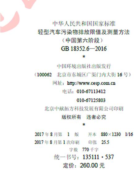 國六標準的全文,有400頁之巨,可在中華人民共和國生態環境部官網下載到電子版——如果你有興趣翻到最后一頁,還會發現這套標準已有書刊號、且印刷出版,定價260元。