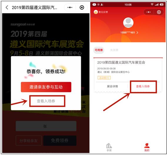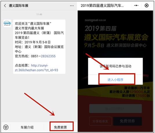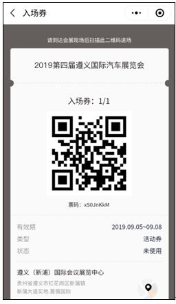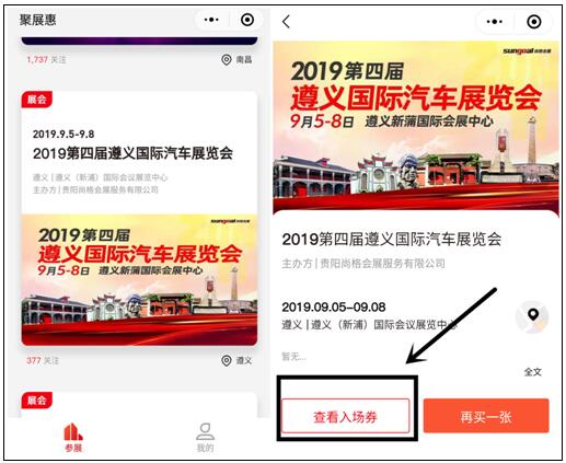 5、怎么查詢?nèi)雸?chǎng)券?在“遵義國(guó)際車展”微信公眾號(hào)菜單頁(yè)面點(diǎn)擊“免費(fèi)索票”,跳轉(zhuǎn)到提示您已參與活動(dòng)頁(yè)面,點(diǎn)擊“進(jìn)入小程序”進(jìn)入聚展會(huì),下拉找到“2019第四屆遵義國(guó)際汽車展覽會(huì)”點(diǎn)擊進(jìn)入,最后點(diǎn)擊“ 查看入場(chǎng)券 ”即可查看你之前免費(fèi)領(lǐng)取的入場(chǎng)券。