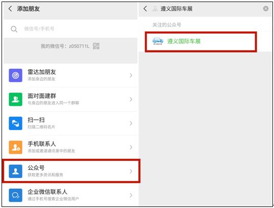 1、微信右上角“ 添加朋友 ”→公眾號(hào)→搜索“ 遵義國(guó)際車展 ”點(diǎn)擊關(guān)注。