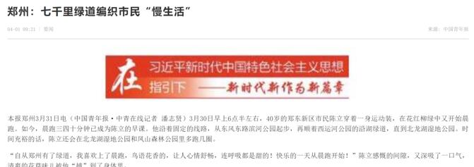 就在前些天的《中國(guó)青年報(bào)》,頭版頭條也點(diǎn)贊了生態(tài)宜居“醉美”新綠城—鄭州。