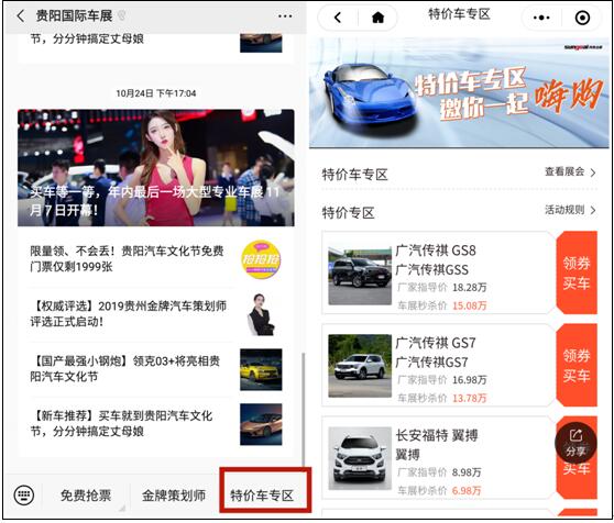 ◆關注【貴陽國際車展】官方微信,進入微信菜單,點擊【特價車專區】,即可參與搶特價車活動,選擇意向特價車型,獲得專屬搶特價車資格券,保存券號,車展期間隨機抽取,成為準車主。(領取特價車券將于11月6日中午12:00截止)