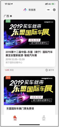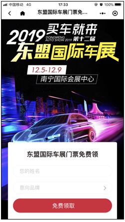 方式二:微信搜索小程序“聚展惠”,找到2019第十二屆中國-東盟(南寧)國際汽車展覽會暨新能源·智能汽車展活動頁面,點擊“免費領券”。