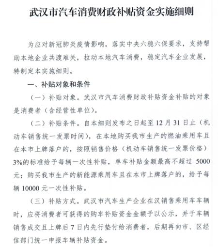 5月14日,武漢市政府發布《武漢市汽車消費財政補貼資金實施細則》。 規定自即日起至今年12月31日,消費者在武漢本地購買武漢生產的燃油乘用車且在本市上牌落戶的,按照銷售價格(機動車銷售統一發票價格)3%的標準給予燃油汽車購車款補貼,5000元封頂;對新能源汽車則按每臺10000元補貼。
