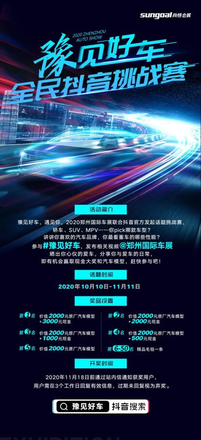 即日起至11月11日期間,拍攝抖音帶話題#豫見好車,發布你與愛車,你中意的車型,相關視頻并@鄭州國際車展,即有機會獲得現金大獎和汽車模型。視頻拍攝截止時間:11月11日23:59