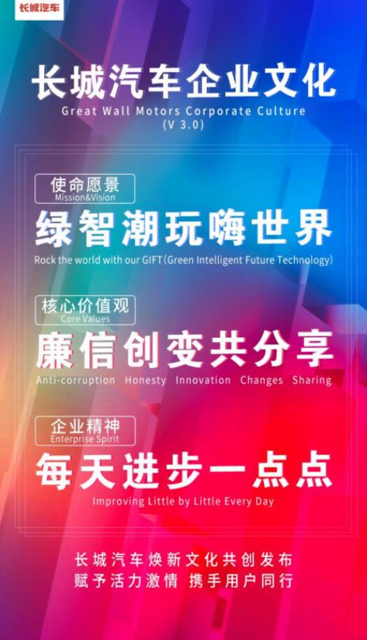 同時,長城汽車發布了“綠智潮玩嗨世界 廉信創變共分享 每天進步一點點”的全新企業文化,從思想戰略層面為轉型指明了緣由與方法論,進一步激發企業上下的使命感、責任感以及成就感。加上內部稱謂“去總化”、員工自創工間操等舉措,一個營造更具活力、鼓勵創新的工作氛圍正在長城汽車形成。