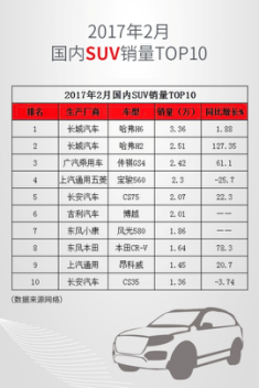 2016年,長城汽車交出了一張讓所有人都滿意的成績單,年銷量達到1074471輛,同時,哈弗也成為中國汽車行業首個達到百萬級的SUV品牌,打造出H2,H5,H6,H7等眾多明星產品。據相關數據顯示,今年2月國內SUV銷量冠軍頭銜依然由哈弗H6摘得,當月銷量3.36萬輛。