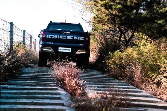 影響車輛爬坡性能的另一個因素是接近角、離去角與離地間隙等參數,這決定了一輛皮卡在爬坡過程中車身和底盤是否會被損傷。長安凱程F70擁有230mm的最小離地間隙,29°接近角和27°離去角,爬坡度為100%(45°),這些數據使得其在面對重慶云陽登云梯這樣的極限坡道也可以如履平地。