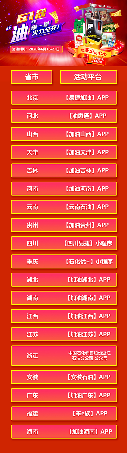 舉個栗子,假如你是北京的車友,在應用商店下載“易捷加油”APP,6月15日-21日期間,點擊首頁的活動入口購買,如果你購買了398元的金吉星SN 0W-40,就會獲得同等價值398元,能夠在易捷便利店消費的代金券,四舍五入相當于免費送了您一桶機油。各活動省市及平臺如下圖: