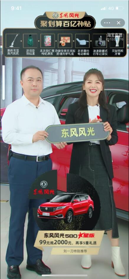9月23日晚,在聚劃算百億補貼官方直播間,聚劃算官方優(yōu)選官&東風(fēng)風(fēng)光首席用戶官劉濤以獨到的精明眼光,為廣大購車者精挑細(xì)選了一款巨劃算的SUV——風(fēng)光580★星版,東風(fēng)小康汽車有限公司總經(jīng)理段偉也在當(dāng)晚空降劉濤直播間,給用戶帶來了多重星享好禮福利。本次直播帶貨不僅是汽車產(chǎn)品實車首次進(jìn)入聚劃算的劉濤直播間,此次直播的場地東風(fēng)風(fēng)光4S店也是劉濤首次在聚劃算官方主導(dǎo)的場地外進(jìn)行直播,東風(fēng)小康汽車公司總經(jīng)理段偉更作為首次進(jìn)入劉濤直播間的企業(yè)高管與劉濤同場解析劃算標(biāo)簽。而以“合資車的品質(zhì)、一半的價格”優(yōu)勢著稱的風(fēng)光580★星版憑借著四重劃算不僅成為了劉濤推薦的精明之選,更牢固夯實了“劃算”標(biāo)簽。