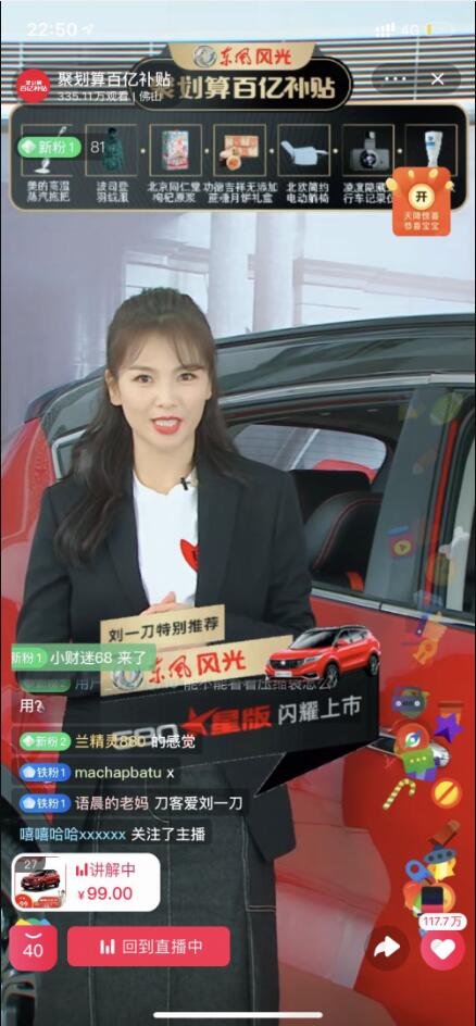 在聚劃算的直播間,由聚劃算的官方優(yōu)選官劉濤直播帶貨,向注重精打細(xì)算的消費者推薦巨劃算的SUV,整場直播無處不在的“劃算”標(biāo)簽讓人印象深刻。劉濤在直播過程中從用戶購車需求入手,對風(fēng)光580★星版的實車外觀、空間、智能進(jìn)行現(xiàn)場體驗,對這款車的劃算之處贊不絕口、金句不斷,生活化、場景化、趣味化、精明化闡釋這款車的四好劃算。而在劃算標(biāo)簽背后,品牌方、平臺方、帶貨明星、選品特質(zhì)的高度契合性無疑是本場直播的最大推手。