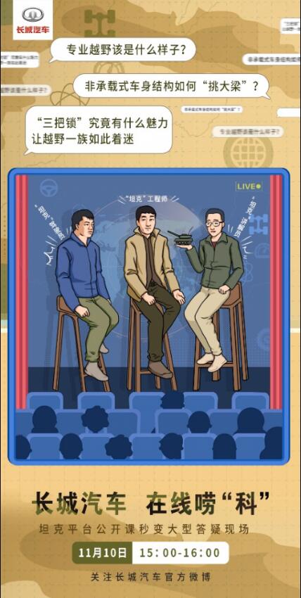 “坦克平臺”,究竟還有多少不為人知的秘密?11月10日15:00-16:00,關注長城汽車官方微博,一切即將揭曉!