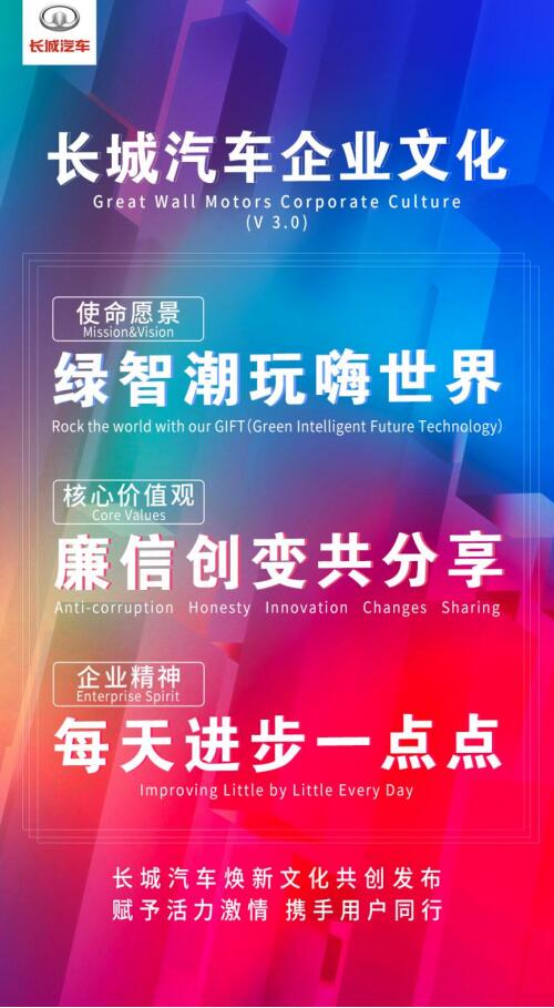 企業(yè)硬實力不斷提升后,長城汽車還將目光聚焦在軟實力建設(shè)上,發(fā)布了21字全新企業(yè)文化——“綠智潮玩嗨世界 廉信創(chuàng)變共分享 每天進步一點點”,從思想戰(zhàn)略層面為長城汽車轉(zhuǎn)型指明了緣由與方法論,進一步激發(fā)企業(yè)上下的使命感、責(zé)任感以及成就感,引領(lǐng)著長城汽車更好地直面未來。