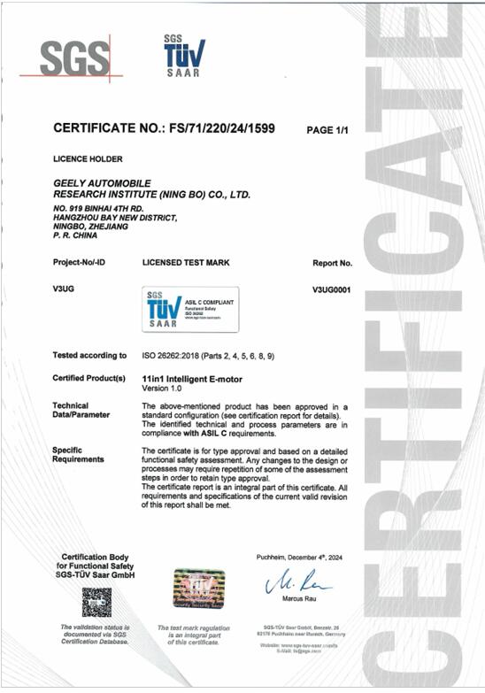 ISO 26262是國(guó)際權(quán)威的汽車功能安全標(biāo)準(zhǔn),SGS對(duì)功能安全產(chǎn)品認(rèn)證審核極為嚴(yán)格,涵蓋了從設(shè)計(jì)、開發(fā)、生產(chǎn)到使用的整個(gè)生命周期,是對(duì)產(chǎn)品功能安全管理體系和技術(shù)能力的全面檢驗(yàn)。吉利11合1智能電驅(qū)成功獲得此項(xiàng)認(rèn)證,彰顯出其在汽車功能安全領(lǐng)域的行業(yè)領(lǐng)先地位,為高復(fù)雜的新能源汽車功能安全樹立了新標(biāo)桿。