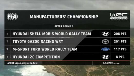 2020年10月12日,為期三天的2020 WRC(世界汽車拉力錦標賽)第六站賽事意大利站結束爭奪,現代汽車WRC車隊憑借著現代汽車WRC賽車的強勁實力與車手Dani Sordo、Thierry Neuville出色的發揮,包攬了本站賽事的冠亞軍,以總分208分的成績幫助現代汽車WRC車隊在制造商排名中反超競爭對手豐田7分,榮登2020年WRC賽事制造商排名第一的寶座。