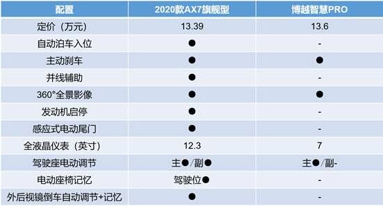 相比2020款AX7在配置上做加法的用心,博越智慧PRO在腳踢感應式電動尾門、外后視鏡電動折疊、自動泊車、下雨自動關閉天窗等配置方面的缺失,著實讓性價比大打折扣。而且在一些關鍵性配置對比中可以發現,2020款AX7在EPB電子駐車制動系統+Auto-Hold自動駐車系統、FCW前碰撞預警系統、AEB剎車輔助系統、BSD盲點監測系統等高端配置價格門檻更低,對于消費者來說更加實惠。