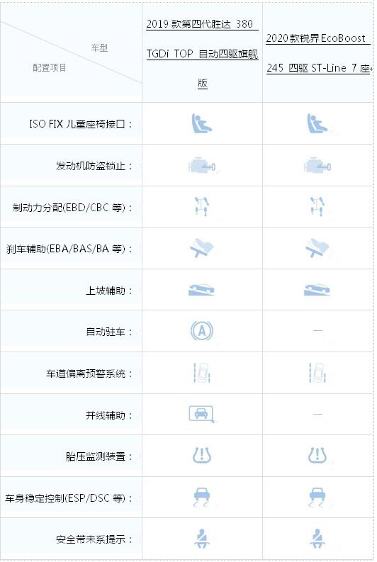 對于這兩位“大塊頭”的消費者來說,除了非常注重空間以外,車輛的安全配置水準也至關重要。通過下方對比可見,兩款車型在安全配置上實力相當且各有千秋,銳界ST-line在被動安全方面配有膝部氣囊;第四代勝達搭載的自動駐車、并線輔助這兩項配置則更加傾向于都市用車的安全及便利性,同時這兩項配置的日常使用率也更高。