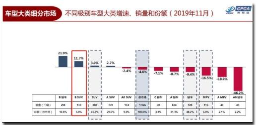 乘聯會數據顯示,2019年11月全國乘用車市場同比下降4.1%,而B級SUV市場同比增幅卻高達11.7%,目前已連續兩個月實現同比正增長,也是當前SUV市場中增幅最大的細分市場。