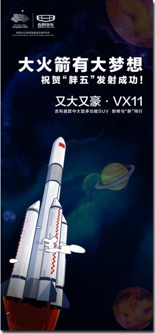 12月27日,在中國“最強火箭” ——“胖五”長征五號遙三運載火箭成功發射升空的當天,吉利汽車也通過官微露出了旗下首款中大型多功能SUV——代號“VX11”。即將亮相的VX11,是吉利汽車繼博越、繽越、星越等明星車型之后,進軍中大型SUV市場的重磅產品,將填補吉利在該領域的空白,有望開辟新的藍海市場。