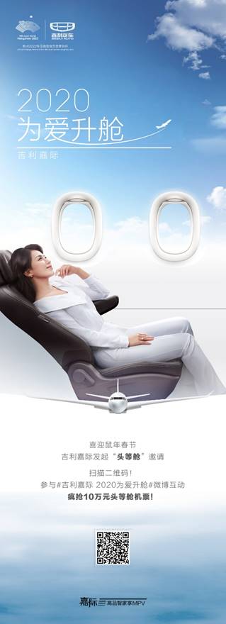 1月6日,“嘉際首席愛享大使”劉濤在微博了發(fā)布春節(jié)回家祝福視頻,并向全國網(wǎng)友發(fā)起“全家頭等艙”邀請。用戶即日起只需登錄新浪微博,加話題#吉利嘉際 2020為愛升艙#,上傳兩張最能展示家庭生活變化的全家福,并@吉利汽車,即可參與此次活動。吉利汽車將在1月14日—1月16日,每日抽取1組錦鯉家庭,為3組家庭免費贈送不超過7張的飛機頭等艙或商務(wù)艙機票。獲獎家庭如果尚未購買春節(jié)回家機票,吉利汽車將為其購買選擇時間段的頭等艙/商務(wù)艙機票,優(yōu)先長龍航空最高等座艙;如果已購買經(jīng)濟艙機票,吉利汽車將為其把機票升艙至頭等艙/商務(wù)艙。