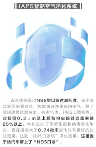 真車規級“N95口罩”空調濾芯不僅可以防霉除異味,除煙霧、粉塵、花粉等易致敏物質,還能實現對直徑0.3µm的顆粒過濾效率達到95%以上,新冠病毒吸附的通常大于0.74µm飛沫過濾效率能達到98%,該系統還能有效過濾掉空氣中的PM2.5顆粒,攔截效率達99.9%以上。同時結合紫外燈、臭氧、等離子等殺菌技術,做到對病毒、細菌等有害物質進行有效隔離,為用戶帶來無菌化的車內環境。