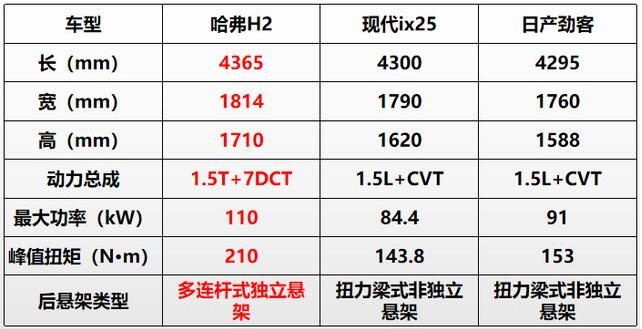 而在動力方面,哈弗H2搭載了1.5T渦輪增壓發動機,匹配格特拉克7速濕式雙離合變速器,最大功率為110kW,峰值扭矩達210 N•m,而現代ix25和日產勁客則搭載1.5L+CVT的動力組合,二者最大功率分別為84.4kW和91kW,峰值扭矩分別為143.8N·m和153N·m。從中也可看出,哈弗H2動力明顯領先于同級競品,達到主流緊湊級SUV的動力表現。