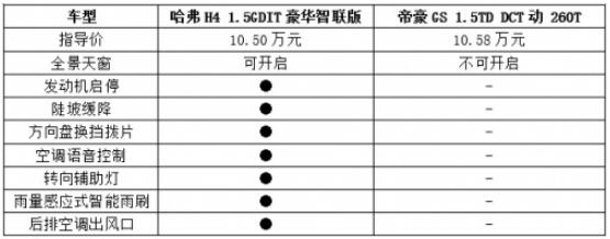 作為國內一線大廠的產品,不管是哈弗H4還是吉利帝豪GS在配置上自然不會怠慢,以價格接近且同為次頂配車型的哈弗H4 1.5GDIT豪華智聯版(以下簡稱哈弗H4 豪華智聯版)及帝豪GS 1.5TD DCT動 260T版(以下簡稱帝豪GS 動 260T版)為例。兩車均搭載了倒車影像、定速巡航、全景天窗、LED自動頭燈等實用配置,但在對配置細節的拿捏上,哈弗H4更為用心。