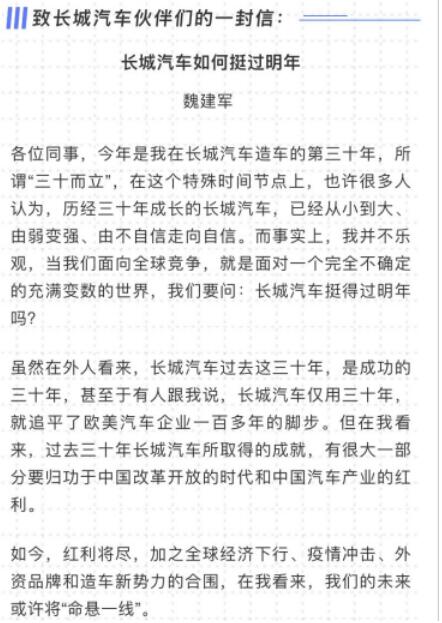 在微電影的話題性以及大眾的質疑聲還在層層發酵之時,長城汽車雷厲風行在各大媒體發出魏建軍致長城汽車伙伴的一封信:長城汽車如何挺過明年?這封公開信可以說是微電影的延續,如果說電影提出了質疑,那么這封信則表明了長城汽車披荊斬棘的實力以及楊帆全球的信念。
