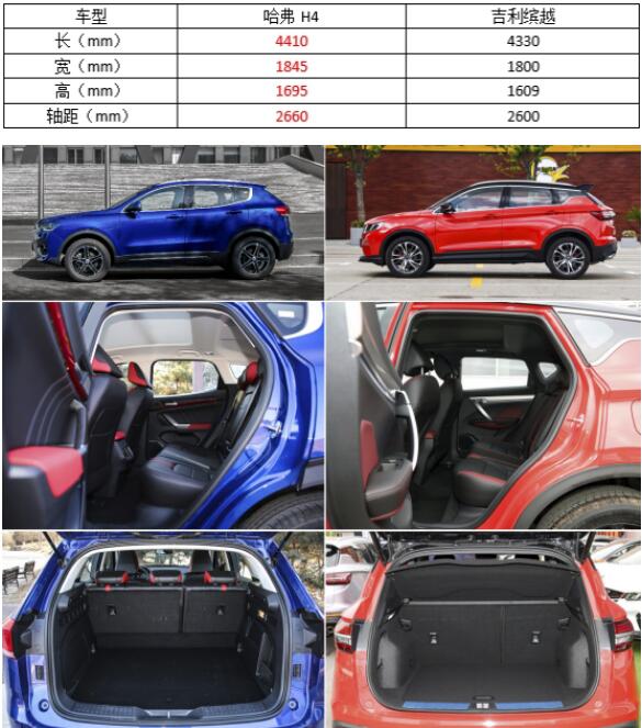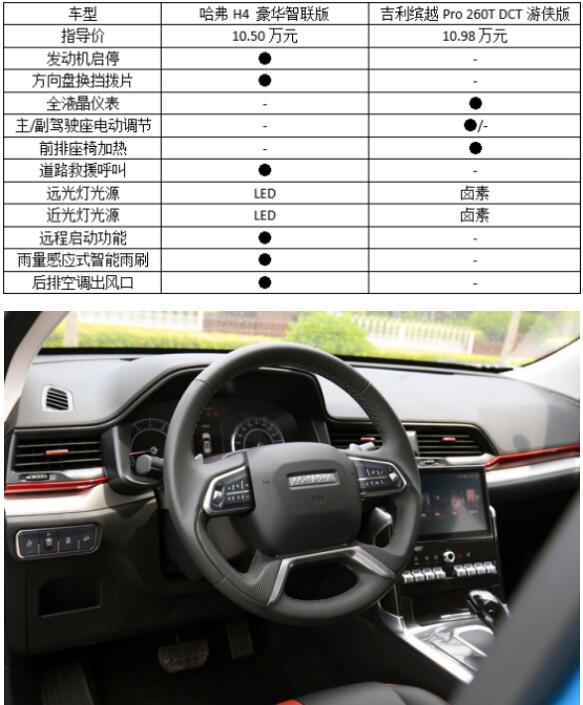 哈弗H4不僅車內空間更為舒適,在細節配置方面也更為用心。以哈弗H4 豪華智聯版與吉利繽越Pro 260T DCT游俠版(簡稱繽越 游俠版)兩款車型為例: