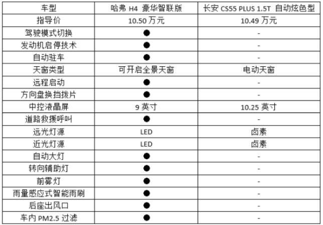 即便是和同價(jià)位的自主車型相比,哈弗H4的品價(jià)比優(yōu)勢也是極為突出的。以定位相接近的長安CS55 PLUS為例,哈弗H4豪華智聯(lián)版(后簡稱哈弗H4)和長安CS55 PLUS 1.5T 自動炫色型(后簡稱長安CS55 PLUS)指導(dǎo)價(jià)格幾乎相同,車身尺寸上僅有細(xì)微差別,但在其他配置方面卻相距甚遠(yuǎn)。