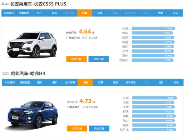 哈弗H4高品價(jià)比不僅反映在配置表單中,在實(shí)際的用戶口碑評價(jià)中,哈弗H4同樣有明顯優(yōu)勢。比如在第三方汽車垂直網(wǎng)站愛卡汽車的用戶綜合口碑對比中,哈弗H4在操控、價(jià)格、油耗等多個維度都大幅領(lǐng)先,綜合口碑得分在與長安CS55 PLUS的對比中無懸念勝出。