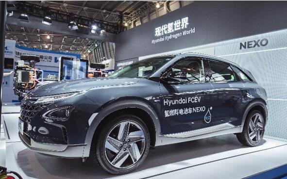來到現代汽車展臺,首先映入眼簾的便是被譽為“終極環保車”的氫燃料電池車NEXO。它是現代汽車于2018年推出的全球首款量產氫燃料電池SUV車型,搭載了一臺135千瓦氫燃料動力系統和三個儲氫罐,僅需5分鐘即可充滿氫氣。在充滿氫氣的情況下,NEXO續航里程超800公里(NEDC標準綜合工況),解決了純電動汽車充電時間長和續航里程焦慮問題。