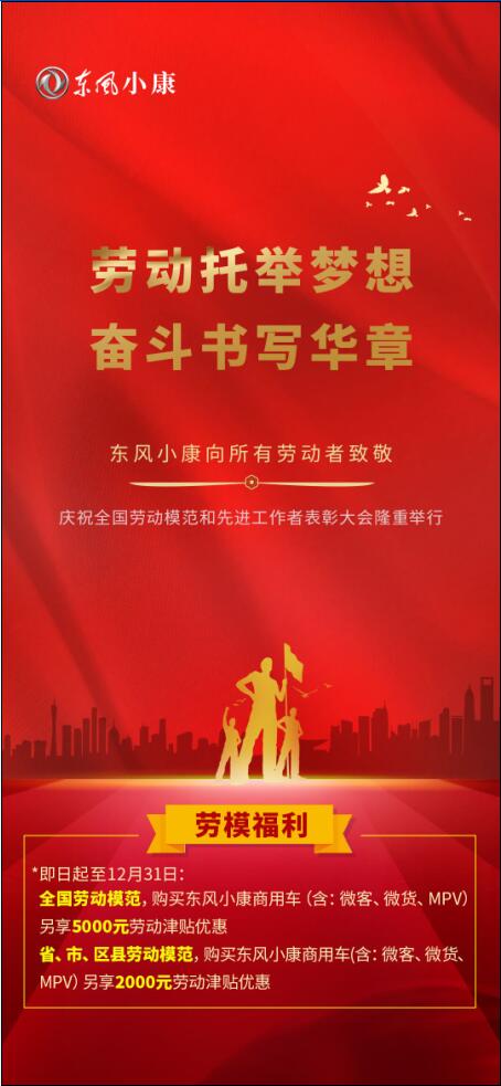 11月24日上午,在北京人民大會堂,一場高規格的全國勞動模范和先進工作者表彰大會隆重舉行,勞模精神、勞動精神、工匠精神再次成為當下主旋律。積極響應國家號召,東風小康商用車率先面向全國各級勞模推出勞模專屬福利優惠,從即日起至12月31日,全國勞動模范購買東風小康商用車(含:微客、微貨、MPV)另享5000元福利優惠。與此同時,省、市、區縣勞動模范勞動模范購買東風小康商用車(含:微客、微貨、MPV)另享2000元福利優惠。