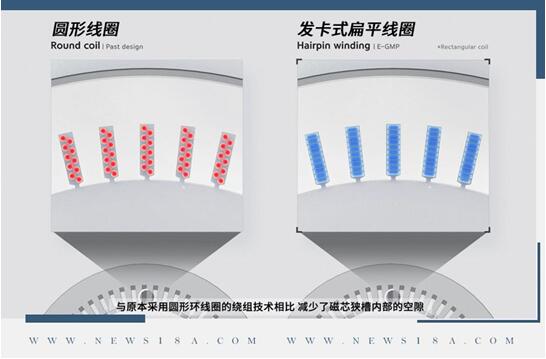 在提升電動機效率方面,E-GMP平臺所搭載的電動機采用了發(fā)卡繞組(Hair-Pin)技術和全新的冷卻方式。普通的驅動電機是由轉子和一個在磁芯狹槽上擾著線圈的定子組成。這種情況下,磁芯狹槽上繞的線圈越密,電子繞組的阻力就會降低,從而實現(xiàn)效率的提升。