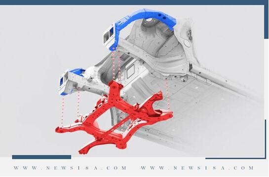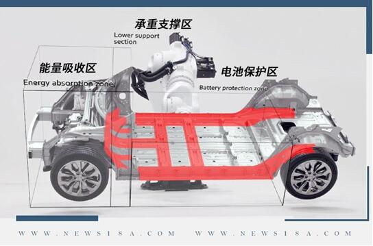 當車輛發(fā)生正面撞擊時,車輛前方位置的撞擊能量緩沖區(qū)會引導車身和底盤等框架結構變形,吸收能量緩解撞擊力。在E-GMP平臺中,儀表盤前方位置的承重支撐區(qū)采用了避險結構,可以最大限度地降低PE模塊和高壓電池組的沖擊力。為了防止乘客保護區(qū)乘坐區(qū)域的變形,該平臺還采用了A柱承重分散結構,并增強了前副車架的前端和車身之間的連接性。