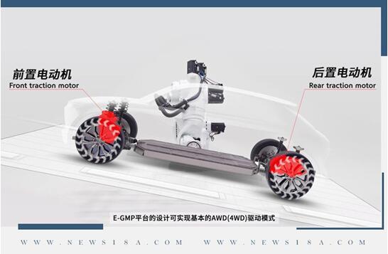 此次推出的E-GMP是以后輪為主要驅動源的平臺。使用該平臺打造的產品會默認后置一臺大功率電動機,根據(jù)車型配置和定位不同,四驅版本的車型還會使用一臺小功率的前置電動機,其主要起到了輔助驅動的作用。