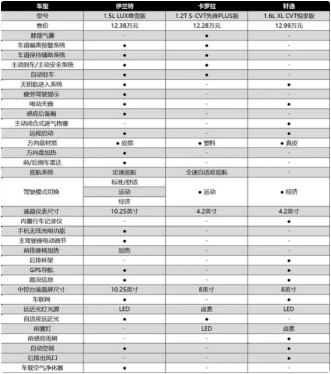作為科技發(fā)燒友的小李,對汽車的智能網(wǎng)聯(lián)配置也是相當(dāng)重視,特別是在選擇人生的第一臺車上顯得格外慎重,他也重點根據(jù)自己12萬預(yù)算列出了自己能買到的配置:第七代伊蘭特1.5L LUX尊貴版、卡羅拉1.2T S-CVT先鋒PLUS版、以及軒逸1.6L XL CVT悅享版,可以發(fā)現(xiàn)卡羅拉和軒逸的配置沒有給他帶來太多驚喜,只有第七代伊蘭特才真正做到了讓他眼前一亮。
