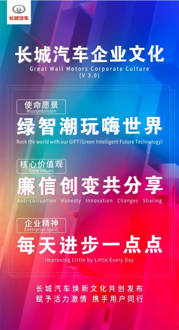 同時,結(jié)合行業(yè)發(fā)展趨勢與自身發(fā)展?fàn)顩r,長城汽車發(fā)布了全新的企業(yè)文化“綠智潮玩嗨世界 廉信創(chuàng)變共分享 每天進(jìn)步一點(diǎn)點(diǎn)”,以它作為長城汽車新的“靈魂”,激發(fā)出源源不斷的內(nèi)動力,讓企業(yè)本身更加同心齊力,無懈可擊,從而更好的擁抱變化,直面未來挑戰(zhàn)。