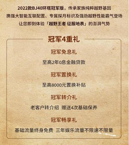 同時,北京越野還為2022款環塔冠軍版車主準備了冠軍免息禮、冠軍置換禮、冠軍轉介禮、冠軍暢享禮四重大禮,并攜手上海永久打造了限量300臺的采用冠軍版車身同款專屬拉花的限量款環塔越野單車,搶先預訂交付即可獲得。